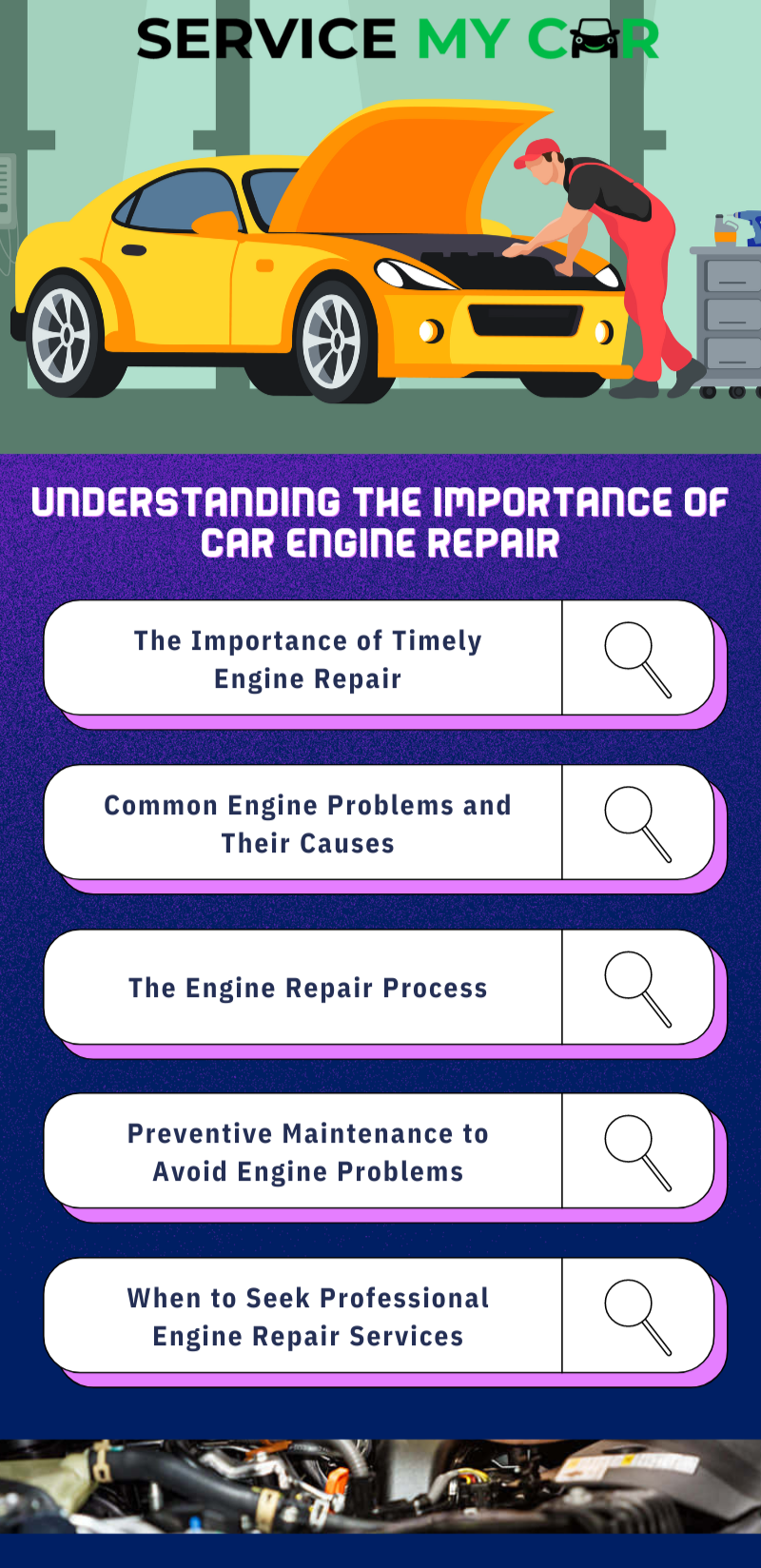 In conclusion, car engine repair is a critical aspect of vehicle maintenance that requires timely attention and professional expertise. By understanding the common engine problems, recognizing the signs of trouble, and following a preventive maintenance routine, you can keep your engine running smoothly and avoid costly repairs. And when engine repair is necessary, you can rely on the skilled technicians at Service My Car to deliver top-quality service and get you back on the road with confidence..