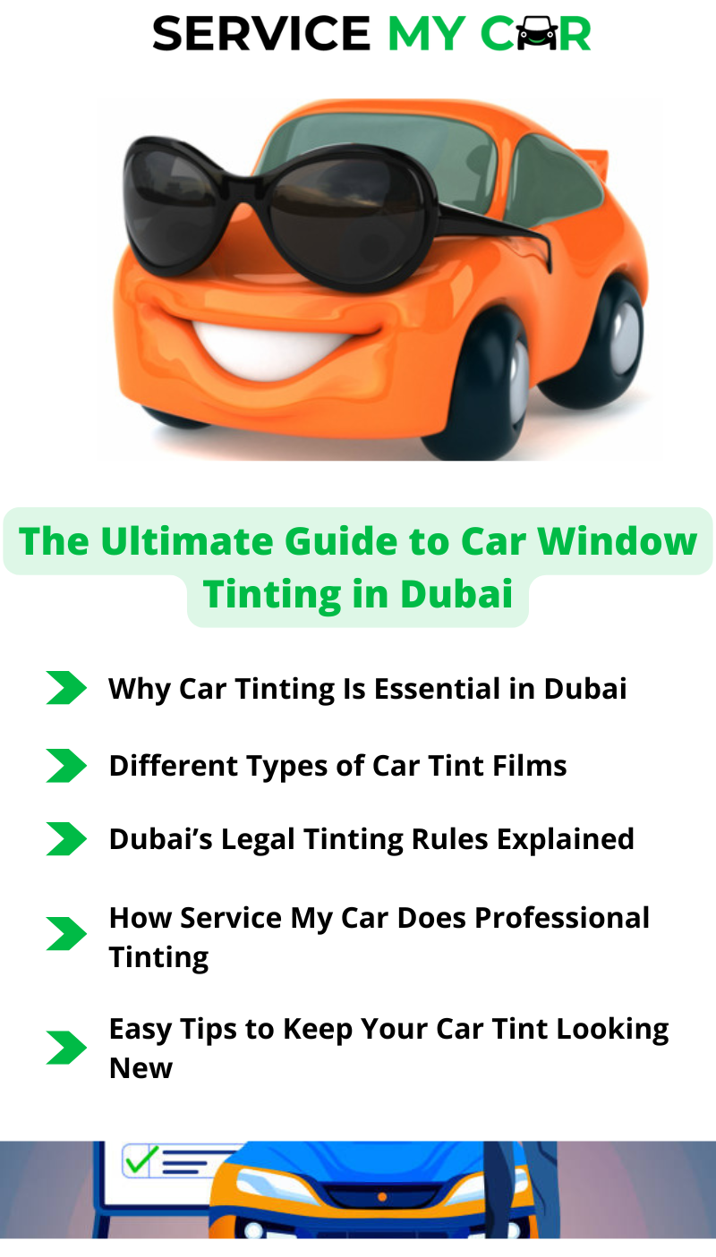Dubai’s blazing sun and year-round warm weather make car window tinting not just a luxury but a necessity. From protecting your car’s interior to enhancing driving comfort, window tinting plays a major role in ensuring your ride remains stylish, safe, and cool on the road. If you’ve been considering tinting your car windows, this comprehensive guide by Service My Car will walk you through everything you need to know about car window tinting in Dubai, from benefits and tinting laws to maintenance tips and expert advice.